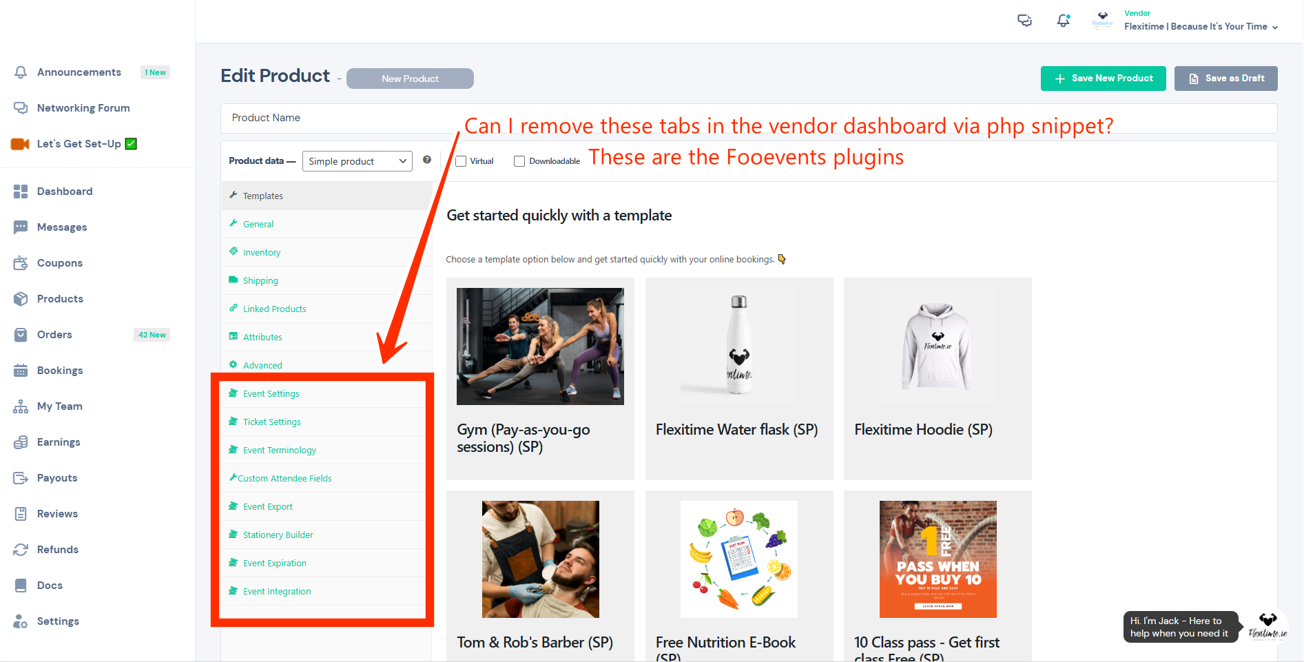 Sure, I can write a snippet to remove those FooEvents tabs from the vendor dashboard.