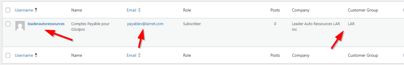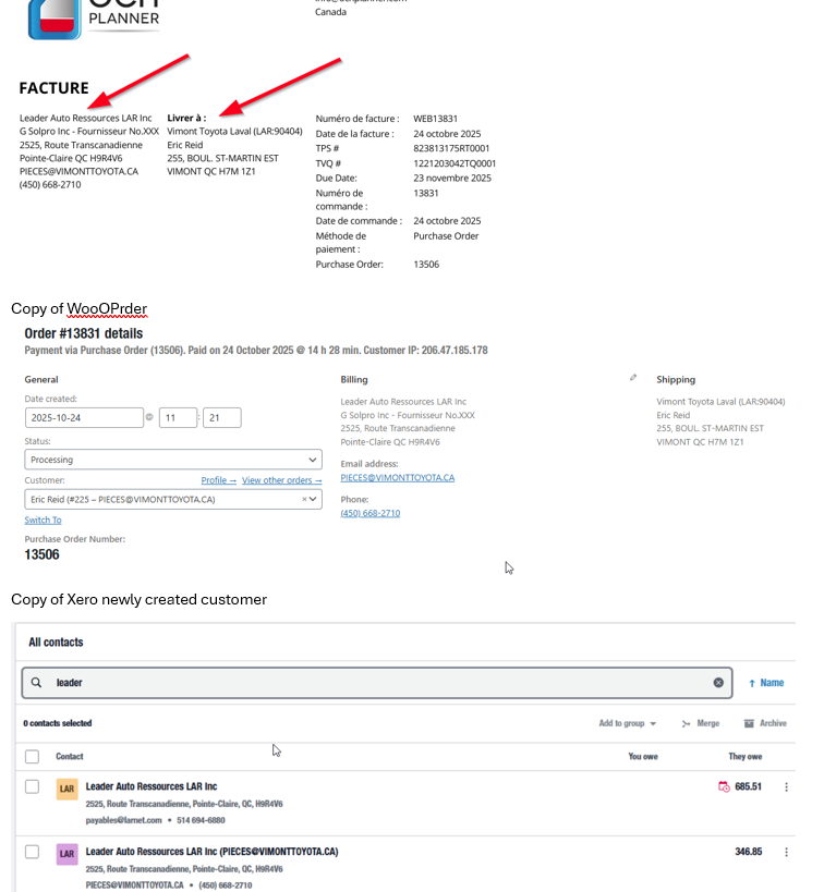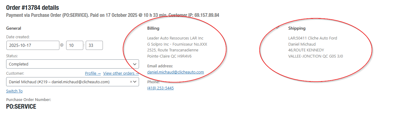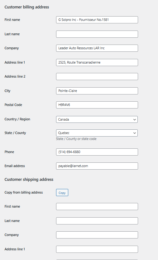 I created a user called [email protected] . This account is the main account that I will have to BILL all the invoices. They have very specific request like that my company name and supplyer name are on the invoices. If I check in WOOcommecer, THis user have NO SHIPPING ADRESSS. Just a billing adresse See image BILL TO vs SHIP TO. You can stt Leader auto ressources and My supplier Name GSolpro No. 1581.