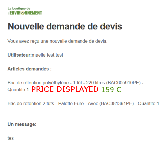 Dans mon système le client peut ajouter au panier des produits avec des prix et sans prix. J'aimerai que le prix s'affiche dans la conversation du client quand le produit a le prix, et aussi dans le mail que l'on recoit qui ce même mail devrait être envoyé automatiquement au client avec les détails de sa demande de devis et le prix qui s'affiche sur le produit qui à le prix l'autre produit sans prix on laisse comme cela.